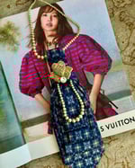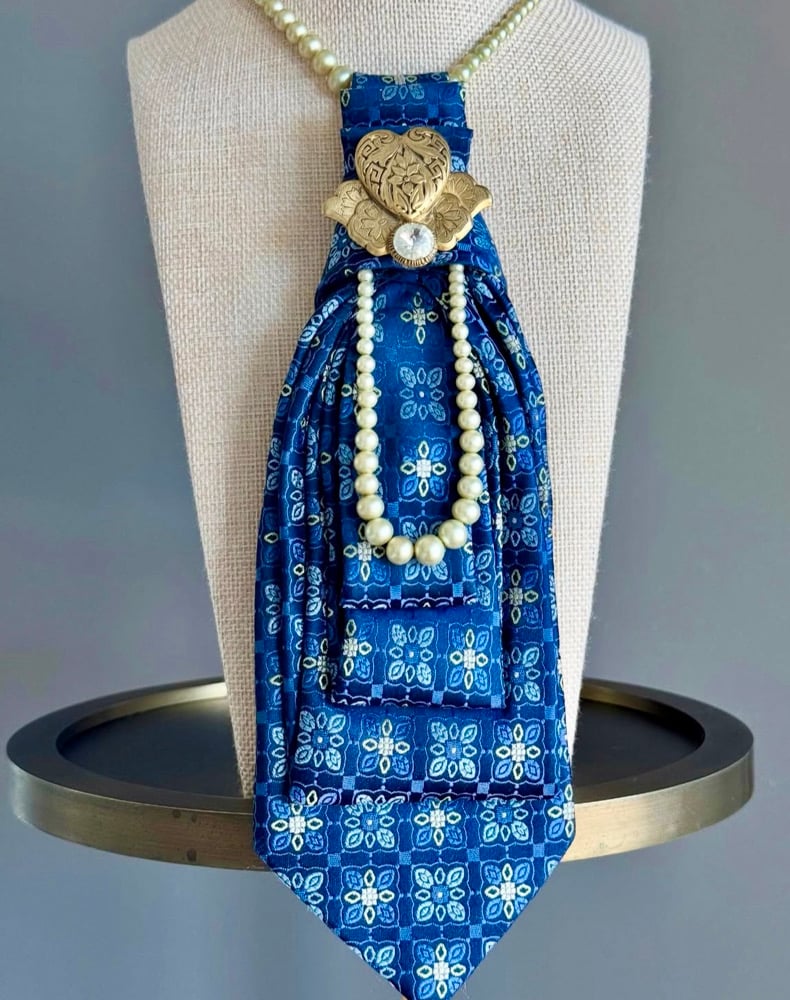 This UpTie is pure romantic royalty with a vintage twist. Made from a silky navy-blue tie patterned with soft yellow and white floral blocks, it’s folded into elegant, draped pleats that frame the show-stopping centerpiece. At the heart is an ornate, antique gold brooch featuring two birds nestled in a heart surrounded by etched leaves and a sparkling rhinestone gem — a sweet symbol of love and connection. A looped strand of creamy pearls cascades gracefully across the front, matching the pearl-beaded necklace that completes this dreamy, heirloom-inspired look.