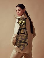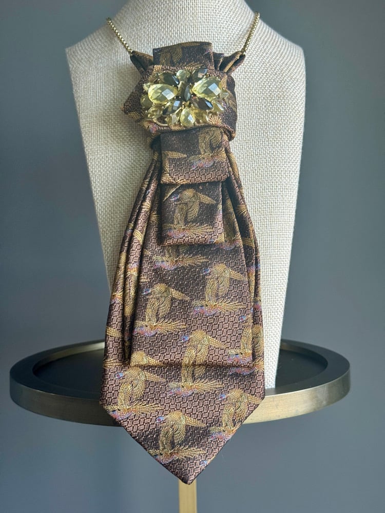 A regal flock of golden birds rests gracefully on this rich chocolate-brown UpTie, their woven wings shimmering with hints of ochre and amber. The textured background adds depth, while the oversized gem cluster—reminiscent of a vintage brooch—radiates luxe, old-world charm. Finished with a gold-toned chain, this piece channels opulence with a hint of the wild.