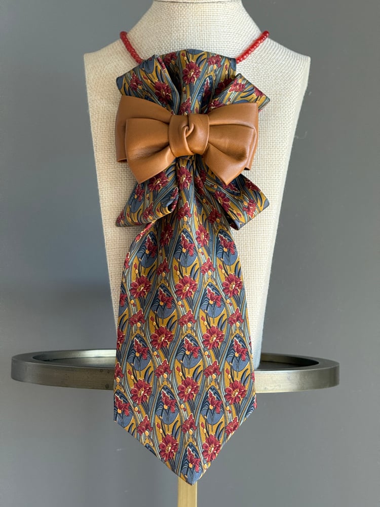 Crafted from a vintage floral silk tie in rich autumnal tones, this one-of-a-kind UpTie is gathered into soft, sculptural folds and finished with a supple caramel leather bow. Hand-assembled and thoughtfully upcycled, Autumn Serenade blends nostalgia, texture, and modern elegance.