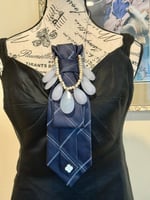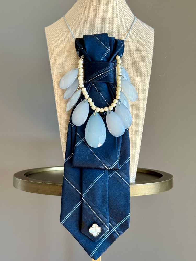 Blue Lagoon is serene sophistication with a splash of fantasy. This UpTie features deep oceanic navy silk with fine sky-blue pinstripes — a refined backdrop for the cascade of milky aqua teardrops and lustrous pearls that drape gracefully across the neckline. The soft translucence of the stones evokes rippling water under sunlight, while the petite clover-shaped pearl accent near the tip adds a whisper of good fortune and charm. This piece feels like a cool breeze — elegant, refreshing, and quietly radiant.