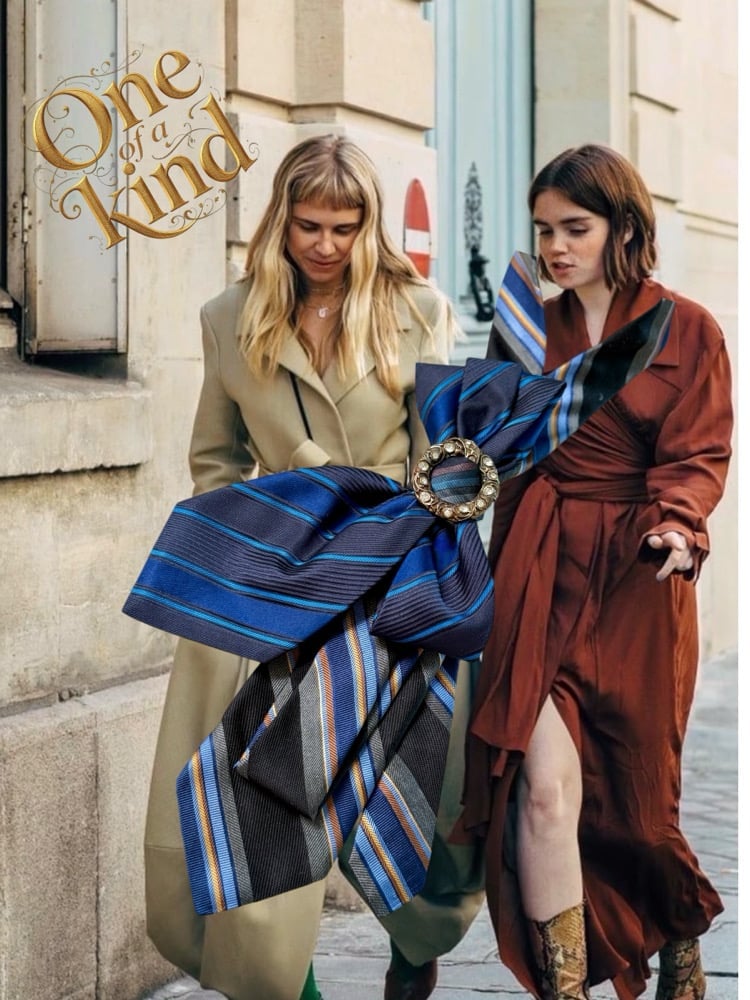 Confident, structured, and effortlessly refined, Blue Steel Affair is a masterclass in modern tailoring. Crafted from layered vintage ties in deep navy, cobalt, charcoal, and hints of gold, this piece plays with contrast, texture, and direction—creating a bold, architectural silhouette.