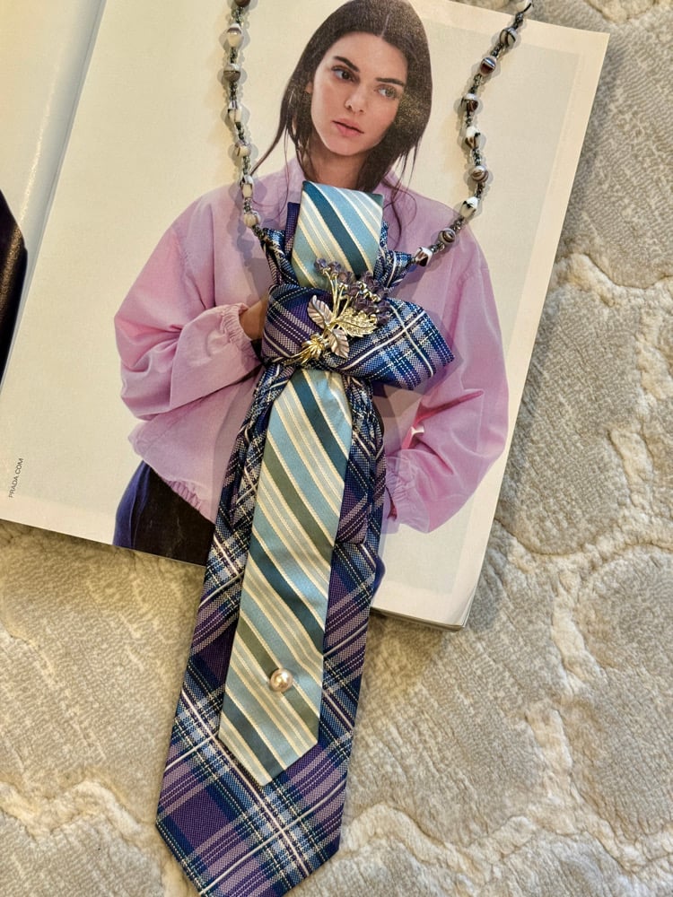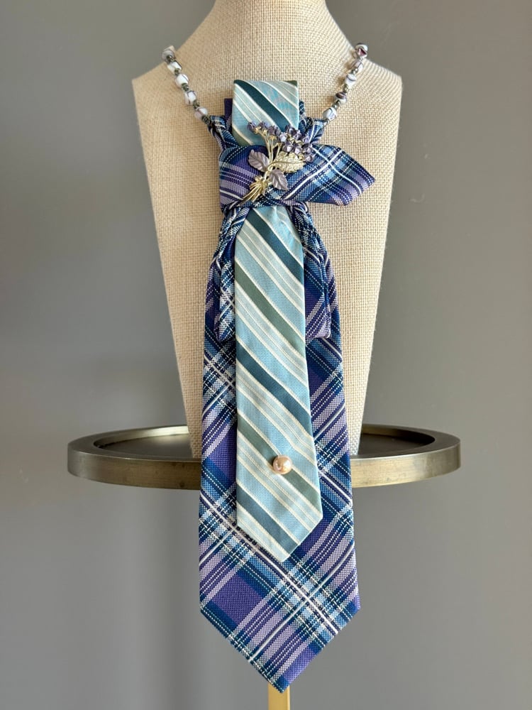 Layers of vintage silk in calming shades of powder blue, navy, and seafoam are sculpted into an elegant cascade, accented with a delicate floral brooch and a single pearl detail. Bluebell Grace is a one-of-a-kind UpTie, hand-crafted from vintage men’s ties and thoughtfully reimagined into timeless, wearable art.