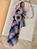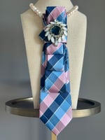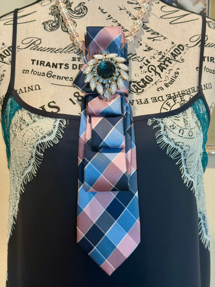 This UpTie is a delicious blend of classic charm and modern chic, crafted from a pink-and-navy argyle silk tie folded into a layered, sculptural design. At its heart sits a vintage sunburst brooch, framed with milky moonstone petals and a bold midnight-blue jewel — adding a regal, romantic sparkle.