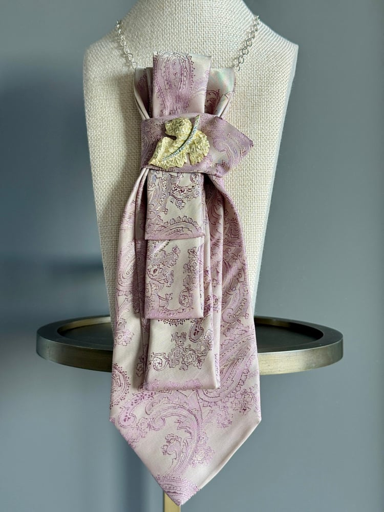 A delicate UpTie crafted from upcycled silk in the palest blush, traced with an elegant paisley motif and gathered into graceful, flowing folds. Finished with a vintage-inspired gold leaf accent, this one-of-a-kind piece feels timeless and feminine—an ode to softness, detail, and gentle strength.