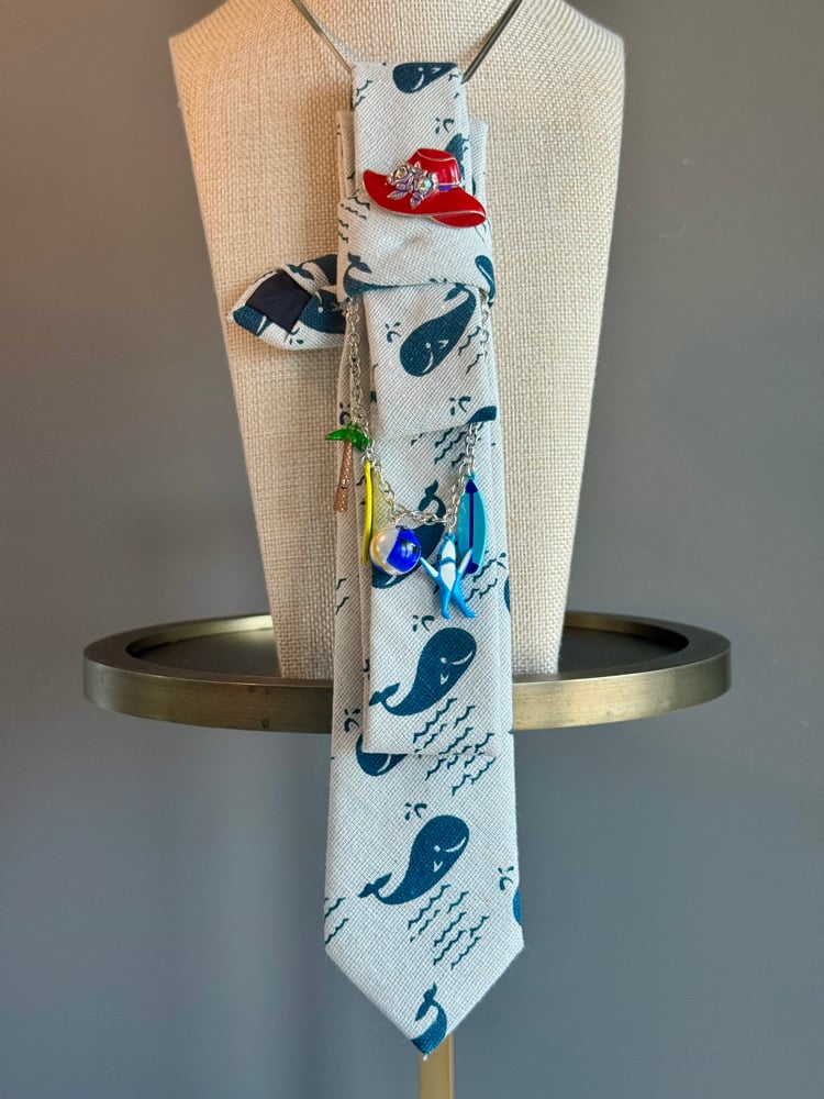 Nautical charm on sandy linen, featuring anchors, ship wheels, and a bold enamel anchor pin. A beach day in tie form.