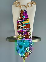 It’s rich. It’s kinetic. It’s joyful.And that chunky gold link collar crowns the whole piece with bold, glamorous energy.