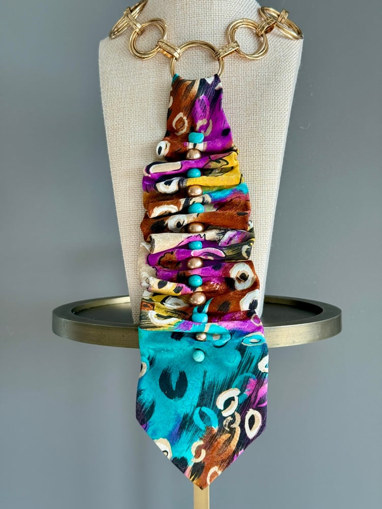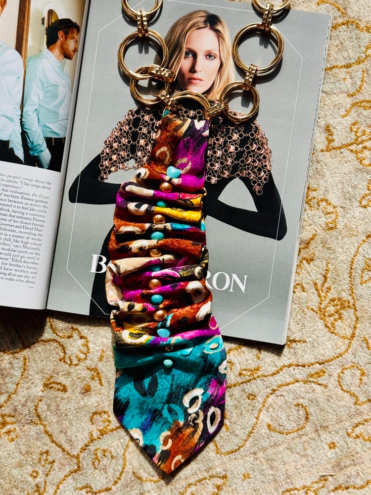 Carnaval Goddess is crafted from a wildly vibrant silk tie bursting with turquoise, magenta, bronze, gold, teal, plum, and sunlit yellow — a palette straight out of a Rio street parade or Marrakech marketplace.