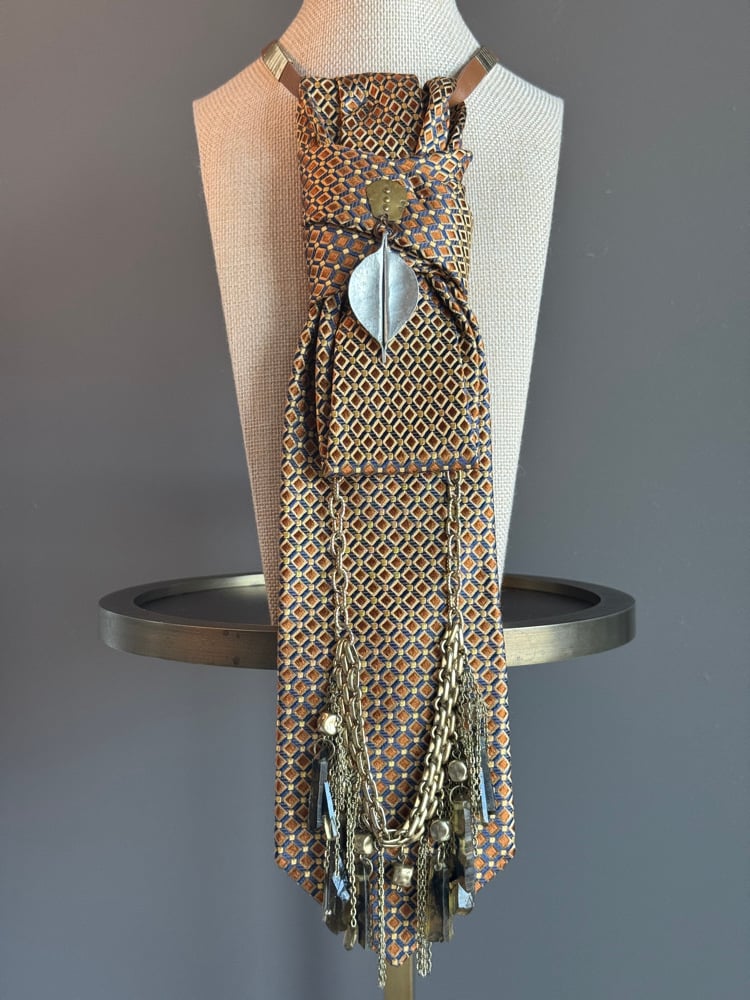 Copper and gold tones form a honeycomb mosaic backdrop, layered with a cascade of bronze chains, smoky glass drops, and a rustic silver leaf. Raw, rhythmic, and wildly original — this UpTie feels like wearable sculpture.