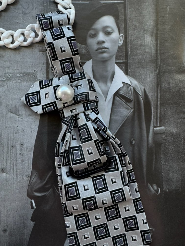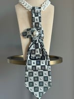 A bold grid of geometric sophistication, this UpTie means business—with a twist. Featuring a monochrome palette of silvery greys and blacks, topped with a commanding pearl accent and retro-modern buckle detail. Perfect for the woman who’s structured, stylish, and just a bit mysterious. Don’t let the grid fool you—she’s full of surprises.