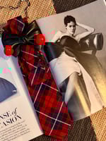 A fearless UpTie crafted from upcycled red-and-black tartan silk, structured into sharp, tailored folds and finished with a dramatic black bow and glossy cherry accents. Equal parts classic prep and rebellious charm, this one-of-a-kind piece brings attitude, humor, and statement style together in one unforgettable design.