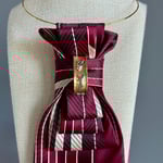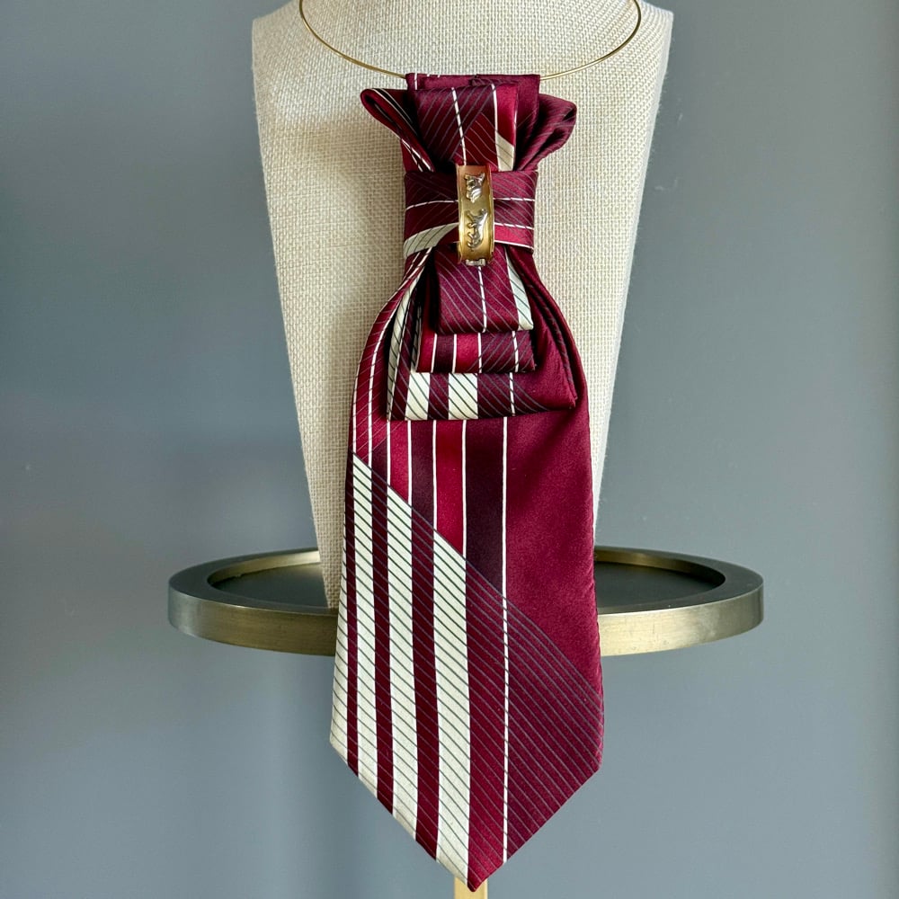 Command attention with confidence and class. This UpTie features bold crimson and ivory stripes, layered into a sculpted, architectural fold that feels both powerful and polished. The centerpiece—a vintage gold bar clip with subtle detailing—adds a touch of strength and sophistication. Perfect for boardrooms, gallery nights, or any occasion where you want your presence to speak before you do.