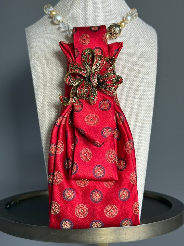- A regal cascade of upcycled crimson silk, patterned with timeless medallions and crowned by an ornate antique-gold filigree bloom. This one-of-a-kind UpTie blends old-world elegance with bold femininity—hand-gathered, richly textured, and made to command attention.