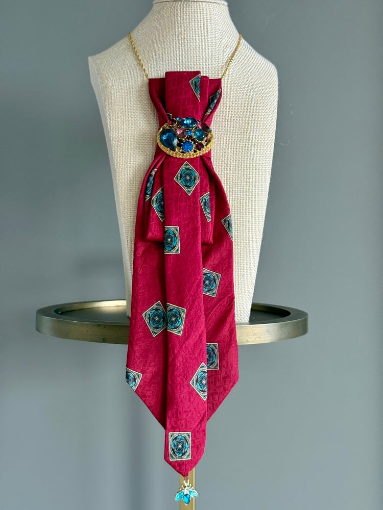 Crimson Maharani is crafted from a luxurious deep-crimson silk tie adorned with teal and gold geometric medallions, giving it an exotic, almost tapestry-like feel.