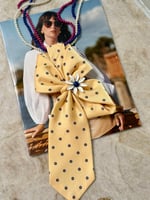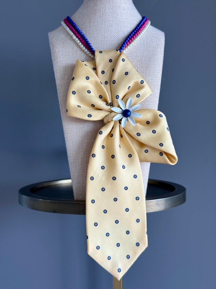 This one-of-a-kind UpTie is crafted from a soft butter-yellow silk tie, dotted with delicate blue medallion details that feel both classic and playful. The sculptural bow design creates movement and softness, while a sweet daisy accent at the center adds a fresh, whimsical touch.