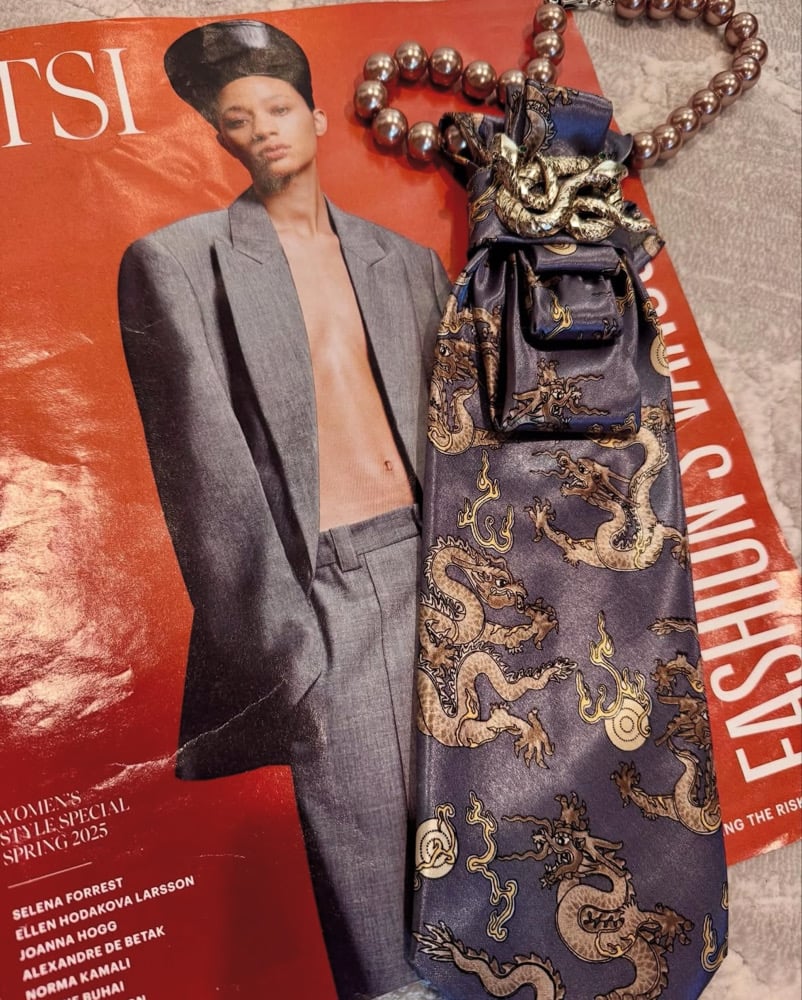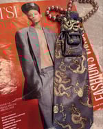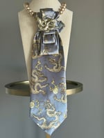 Mystical, commanding, and dripping in elegance—this UpTie is forged in legend. Set on a shimmering smoky lavender satin base, golden dragons twist and rise through plumes of stylized flame, exuding strength and grace. The dramatic knot is crowned by a silver coiled dragon brooch with glinting gemstone eyes, while lustrous rose-pearl beads form a regal neckline. This piece is a talisman of feminine power, ancient wisdom, and unapologetic glamour.