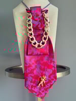“El Matador” commands attention with a bold crimson silk base woven with cobalt blue dragons, radiating confidence and flair. The statement gold chain detail adds a fierce, fashion-forward edge, while the vintage gold matador pin seals its story — a nod to courage, artistry, and timeless showmanship.