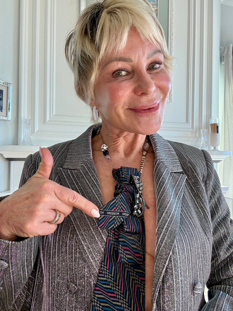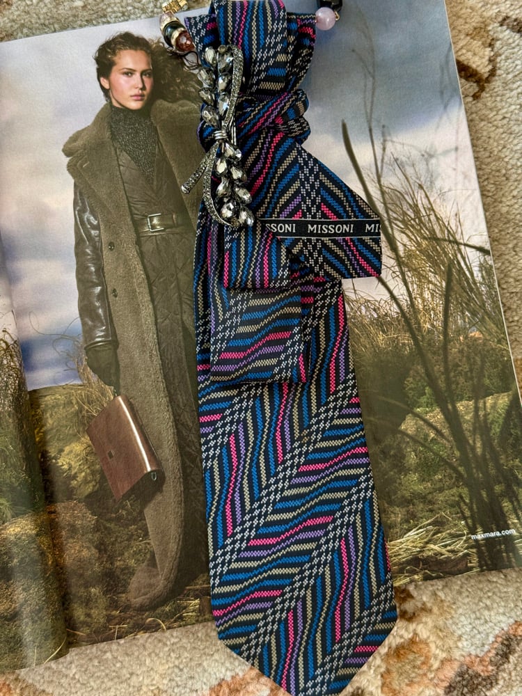 A striking rhythm of zigzag lines in jewel tones—teal, magenta, cobalt, olive, and ivory—this one-of-a-kind UpTie is hand-crafted from a vintage Missoni designer silk tie. Sculpted folds and a smoky crystal brooch add texture and movement, transforming iconic pattern into modern wearable art.