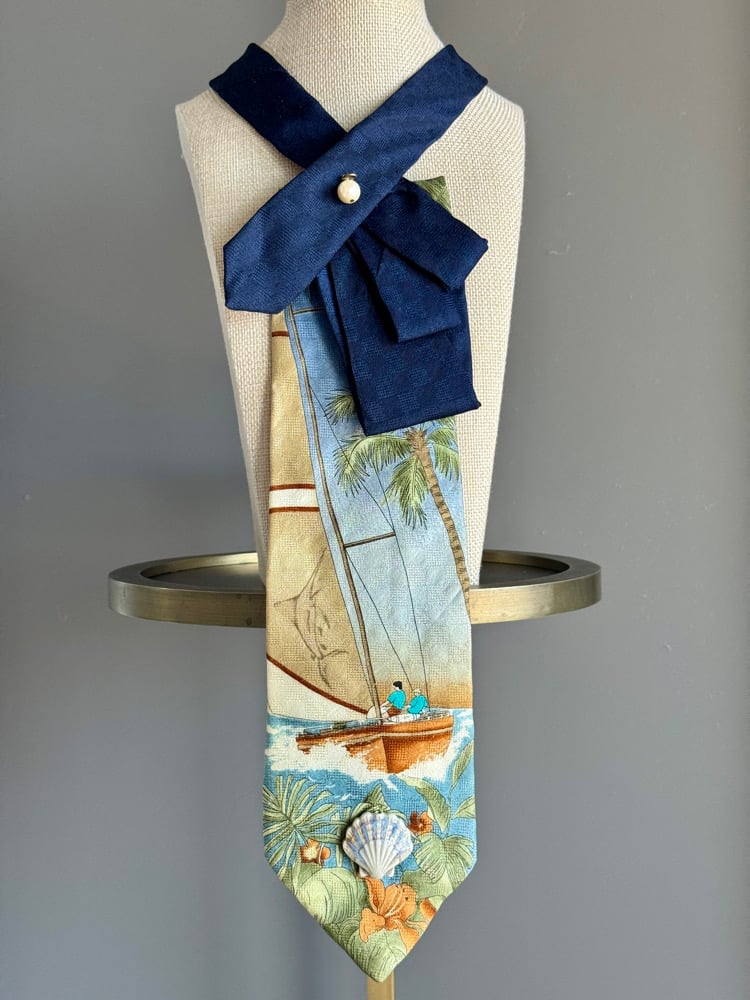 This UpTie sets sail for paradise with a painterly scene of a boat drifting past palm trees and lush island foliage, all in soft blues, sandy browns, and seafoam greens. A real shell embellishment near the tip adds coastal charm, while a single pearl at the folded navy neckline nods to timeless ocean elegance. With its breezy island imagery and resort-ready styling, this piece feels like vacation—no passport required.