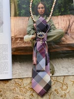 This UpTie dazzles with a geometric plaid in soft jewel tones of mauve, slate, and midnight. At its heart, a radiant crystal-studded eye brooch watches over with a sapphire-blue center and teardrop gem, adding intrigue and symbolism. Paired with a delicate pearl strand, Eye of Elegance is both protective and enchanting—a statement accessory that blends mystery, glamour, and timeless sophistication.