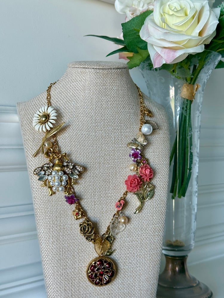 Delicate daisies, carved roses, luminous pearls, and whimsical details come together in a perfectly imperfect harmony, creating a bold statement necklace—designed to be the focal point of any outfit.
