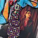 A kaleidoscope of jewel-toned triangles in gold, burgundy, and navy makes this piece pop with playful precision. Tied with a silky ribbon collar and finished with a glitzy gold drop brooch, it’s geometric glam with serious flair.
