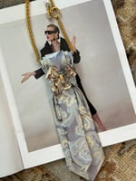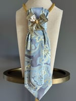 A soft dove-gray paisley tie, brushed with touches of gold and sky blue, is crowned with a gleaming golden bow centerpiece. The polished gold chain enhances the elegance, making this UpTie a perfect blend of sophistication and playfulness. A statement necklace that whispers luxury while radiating charm — ideal for those who love to shine with subtle grace.