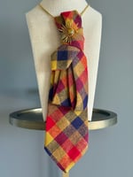 A warm, nostalgic nod to autumn’s boldest hues — this UpTie blends golden mustard, russet red, and deep navy in a rich plaid pattern that feels both rustic and regal. The statement sunburst brooch, centered with a tiger’s-eye stone, radiates energy and confidence — like catching the last golden rays of a fall sunset. A delicate gold chain adds a modern twist, balancing vintage texture with a touch of glam.