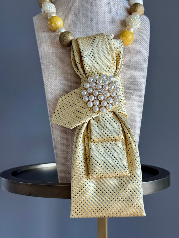 Radiating sunshine and sophistication, Golden Hour Grace is the epitome of soft glamour. The buttery gold tie shimmers with a subtle lattice texture, catching the light like a warm afternoon glow. A luminous pearl-and-crystal cluster blooms at its center — a timeless nod to vintage femininity. The beaded neckline, a dreamy mix of pearls, golden hues, and soft textures, ties the whole look together in effortless harmony. It’s both radiant and refined — perfect for those who believe elegance never goes out of style.
