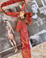 This UpTie is pure drama and vintage theatrical flair. The tie itself is a rich paisley in deep burgundy, gold, and orange — reminiscent of old-world tapestries or a dashing 1920s smoking jacket. It’s tied in an exaggerated downward bow, letting the long tail flow freely, adding elegance and movement. The pièce de résistance? A glamorously eccentric brooch featuring a gilded woman’s face adorned with rhinestones, metallic tinsel, and golden sparkle. She’s giving flapper queen meets avant-garde icon.