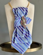This UpTie is a swirl of lavender confidence and vintage sparkle. Crafted from a silky striped tie in lavender, periwinkle, and ivory, the tailored folds create a structured, sculptural silhouette that feels both crisp and playful. The highlight is a shimmering silver brooch shaped like entwined feathers or leaves, accented with a halo of tiny pink and ruby rhinestones — a glamorous wink of old-Hollywood drama. Finished with a bold gold chain, this piece is part power accessory, part wearable jewel.