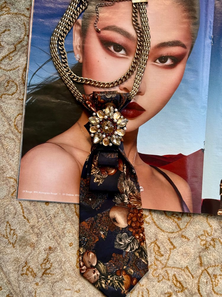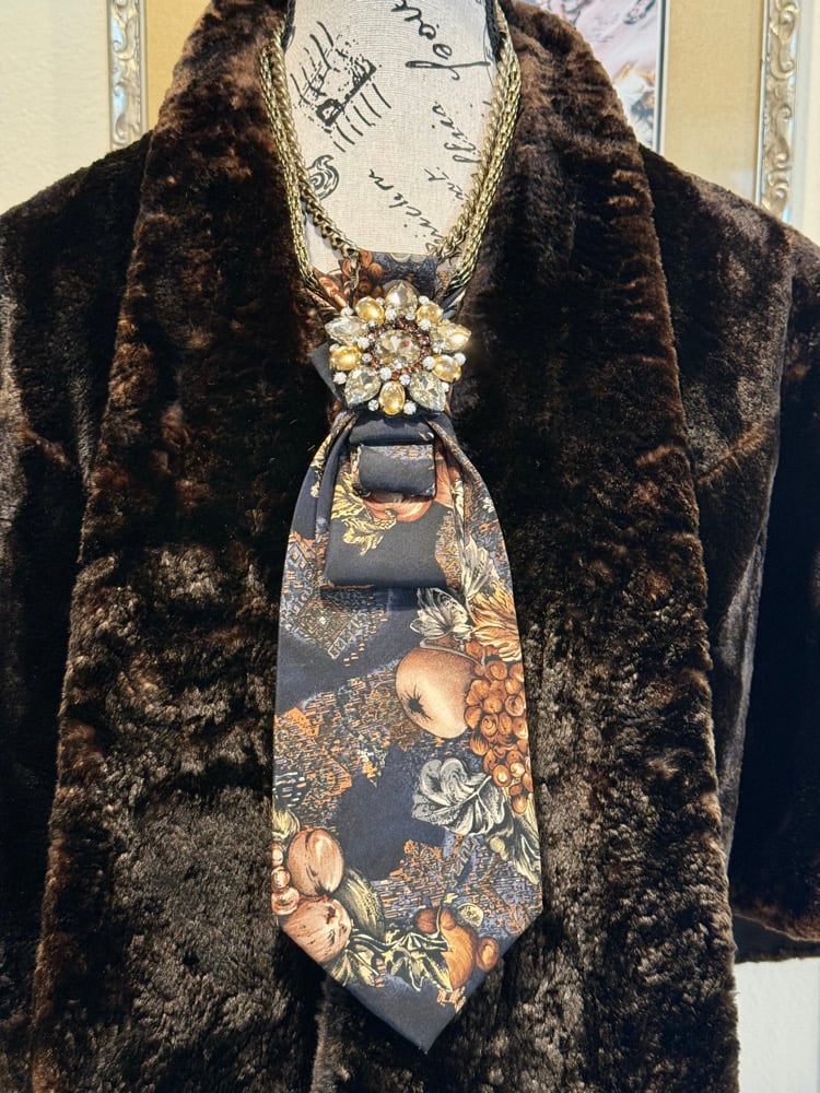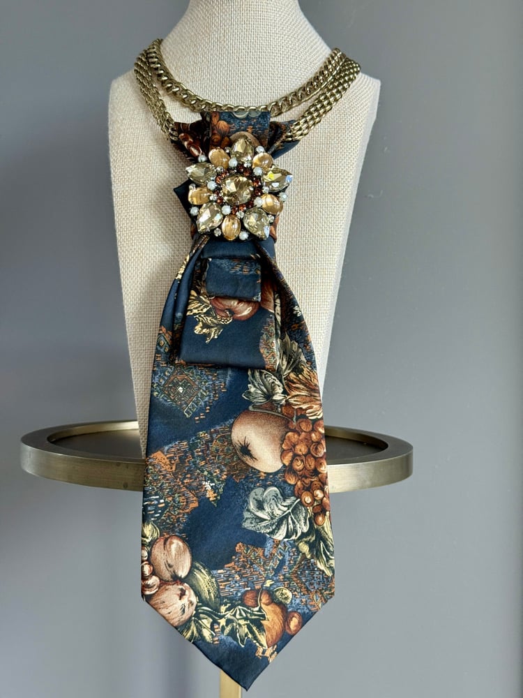 A lush tapestry of abundance, Harvest Royale celebrates nature’s bounty with a painterly print of fruits, leaves, and golden tones on a deep midnight ground. At the neckline, a dazzling vintage brooch bursts like a jeweled star, framed by layered chains that add depth and regality. This UpTie feels both opulent and organic—like a Renaissance still life brought to life—perfect for evening wear, autumn gatherings, or anyone ready to embody timeless elegance with a bold, artful twist.
