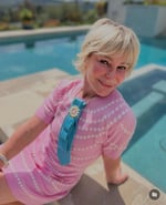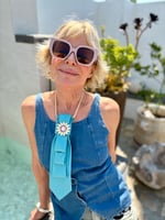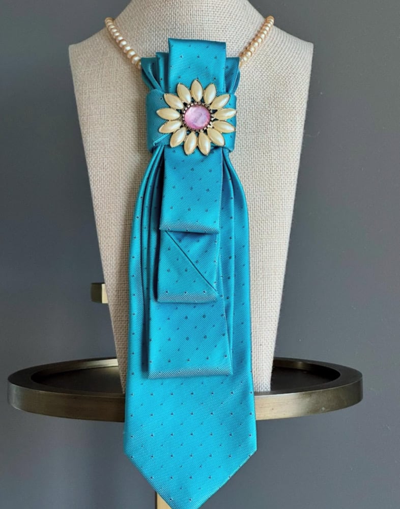 Sweet as spring and styled to shine, this UpTie features a bright turquoise blue base dotted with tiny polka points for a playful touch. Folded into an elegant fan shape, it’s topped with a daisy-inspired brooch—creamy petals encircling a soft pink center like a garden jewel. A strand of delicate pearls completes the look, adding vintage flair to this flirty, floral-forward piece. It’s sunshine in tie form—pure joy with a side of grace.
