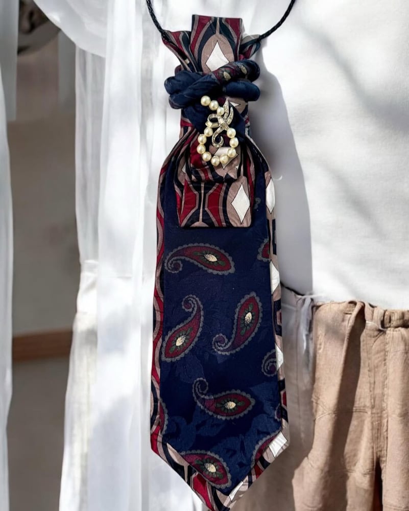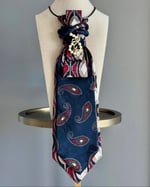 This double-layered UpTie is moody, mysterious, and full of vintage charm. The base layer features classic navy and deep burgundy paisley motifs, accented by a wide border of geometric diamonds in muted metallic tones. Layered on top is a complementary tie with the same bold border, folded into elegant tiers that build dimension and drama. Tucked at the center is a vintage pearl and rhinestone brooch in a looping flourish — part Victorian elegance, part rock ’n’ roll rebel. The black twisted cord necklace subtly finishes the look with understated edge.