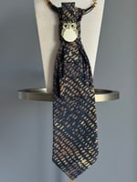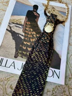 This UpTie features a bold black base speckled with shimmering bronze brushstrokes—like a stormy night sky scattered with sparks. Perched front and center is a charming gold-tone owl brooch with inlaid crystal eyes and a smooth ivory belly. Paired with chunky tortoiseshell and gold chain links at the neckline, this statement piece is equal parts earthy glam and night-owl chic.