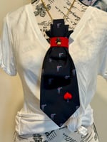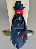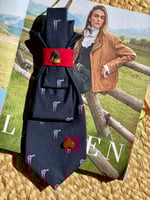 Bold, playful, and undeniably powerful — Heart of the Stallion captures the spirit of strength wrapped in charm. The navy silk canvas is peppered with embroidered red and blue horses, galloping in perfect rhythm across the tie. A striking red band cinches the center, crowned with a sculptural black horse head and gold bridle pin — a nod to power and elegance. Near the tip, a glossy red heart gleams like a badge of passion, completing this UpTie’s story of courage and love.