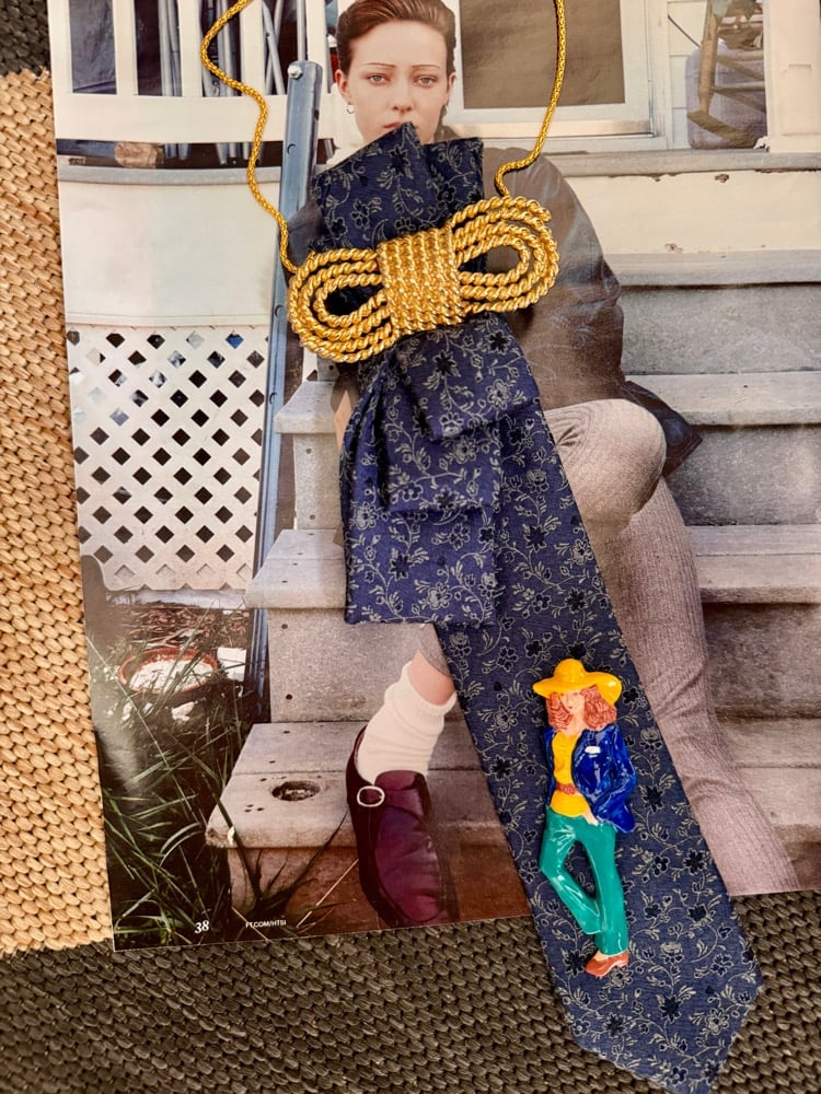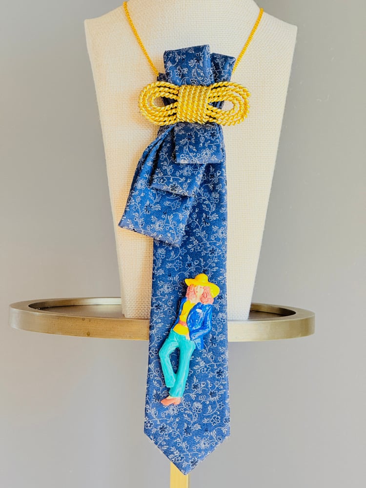 A one-of-a-kind UpTie crafted from a vintage blue floral silk tie, cinched with a bold rope-knot detail and finished with a playful cowgirl charm. Hand-assembled and thoughtfully upcycled, this piece blends western spirit, independence, and a touch of humor into wearable art.