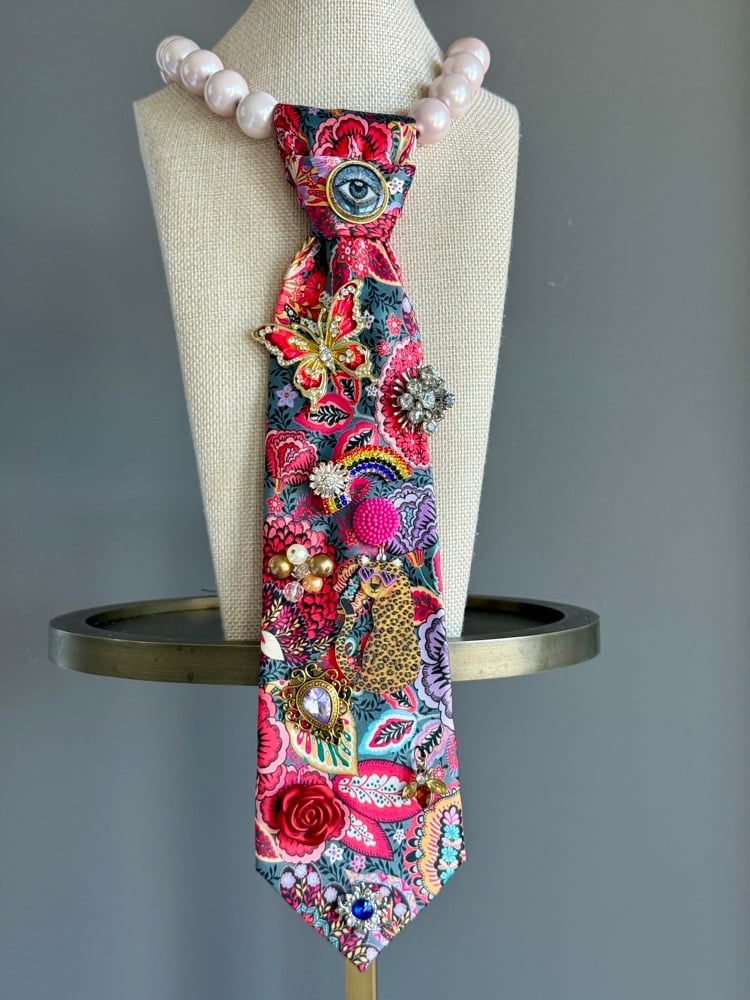 A vibrant tapestry of color, charm, and storytelling, Kaleidoscope Queen is a one-of-a-kind wearable wonder. Set against a richly patterned floral tie, this piece bursts to life with an eclectic mix of treasures—an all-seeing eye, a sparkling butterfly, a radiant rainbow, vintage gems, and playful pops of texture and shine.