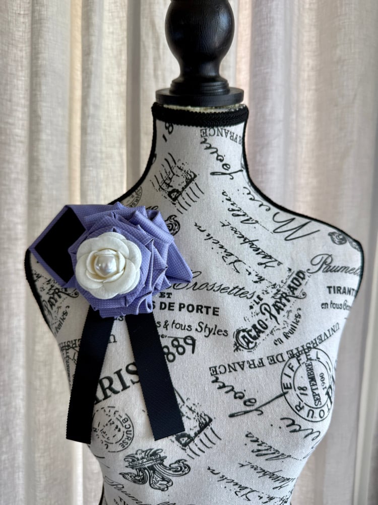 A graceful balance of softness and structure, Lavender Noir blooms with understated elegance. Hand-sculpted in layered lavender fabric, the outer rose unfolds with delicate precision, framing a luminous ivory blossom at its heart—finished with a single pearl that adds a timeless, refined touch.