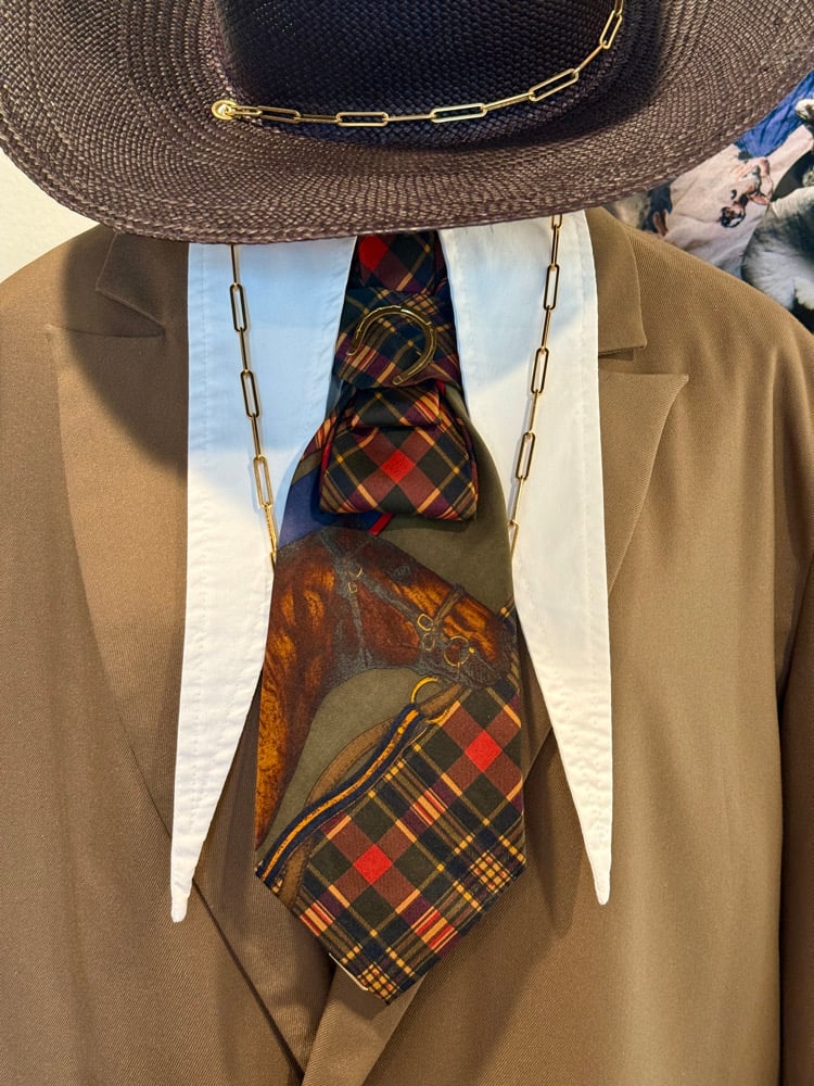 This UpTie gallops into style with a bold red-and-green tartan pattern, paired with a handsome horse portrait subtly woven into the tie. At the knot, a golden horseshoe charm adds the perfect touch of luck and tradition, while the sleek black multi-strand cord necklace keeps the look modern. A piece that blends heritage and horsepower, it’s made for the free-spirited soul who knows life is best lived in the saddle — and in style.