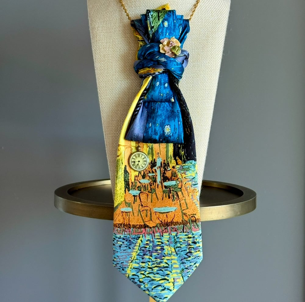 A wearable masterpiece inspired by Van Gogh’s iconic Café Terrace at Night. This UpTie glows with vibrant cobalt blues, sunflower golds, and night-sky strokes that feel alive. The knot is a deep swirling blue—soft folds mimicking the painterly sky—crowned with a delicate vintage blossom brooch that feels like a tiny secret garden.
