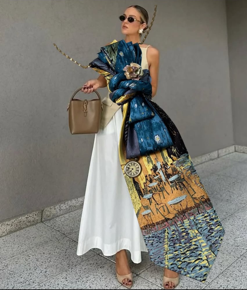 For Women: • A simple black turtleneck or column dress—let the art speak • A denim shirt + long pleated skirt for a modern-muse vibe • A cream satin blouse tucked into wide-leg trousers • Gold hoops + minimalist layered chains for balance