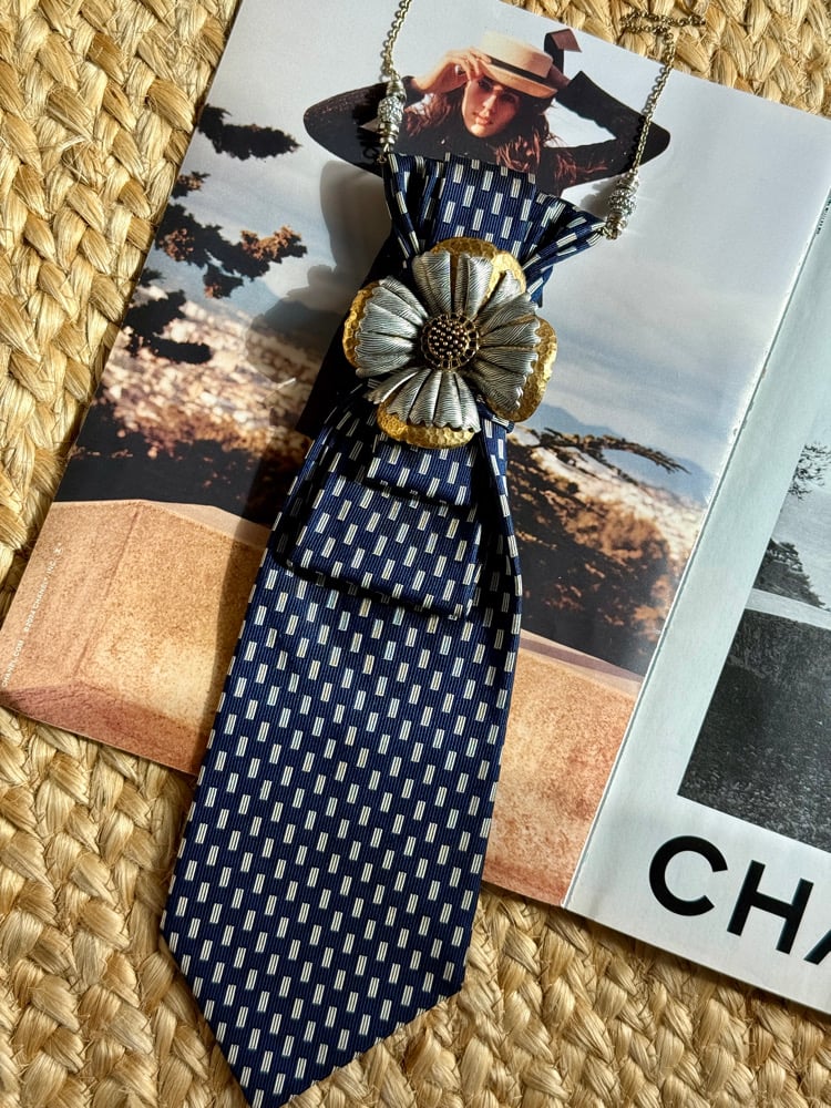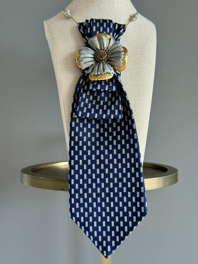 Midnight Marquis is a beautifully structured UpTie crafted from a deep navy silk tie patterned with repeating ivory rectangles — giving it a clean, modern, almost Art Deco rhythm. The folded, tiered construction adds a sculptural flow that feels both tailored and graceful.