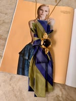 A sophisticated dance between navy twilight and olive green, “Midnight Meadow” captures the calm strength of nature meeting elegance. The bold diagonal stripes evoke timeless tailoring, while the sculpted gold floral brooch—anchored by a deep green cabochon—adds a luxurious botanical touch. The gleaming gold chain softens the structured form, making it feel both commanding and feminine