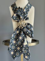 The structured fold at the neckline creates a sculptural silhouette, while the cascading tails elongate the form with effortless grace. At its heart, a luminous pearl-and-gold brooch blooms like a radiant rosette—softening the geometry with a touch of timeless femininity.