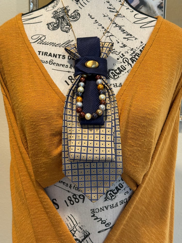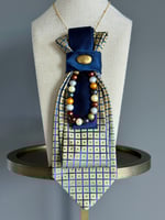 A striking fusion of pattern and texture, Midnight Mosaic pairs navy geometrics with a cascade of earthy, multicolored beads that circle like a radiant medallion. At the neckline, a polished golden stone rests against a deep navy knot, grounding the design with organic warmth. The layered squares create a sense of rhythm and symmetry, while the jewel-toned beads bring a playful, eclectic energy. This UpTie is a confident blend of classic structure and bohemian spirit—perfect for making any outfit unforgettable.