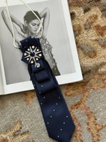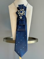 This UpTie is pure celestial elegance — a deep navy silk canvas sprinkled with tiny starlit dots in pale blue and plum, reminiscent of a midnight sky. The real magic happens at the knot: a radiant burst of crystal and silver beams from a bold sapphire-blue center stone, cascading into a dangling crystal accent that glints with every move. The triple-layered bow adds architecture and dimension, evoking the drama of vintage couture with a cosmic twist.