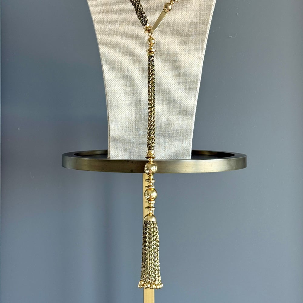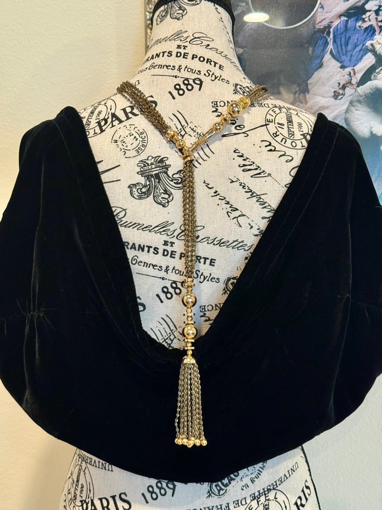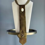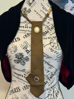 This sleek golden-chocolate-brown UpTie carries an air of mystery and refinement. Accented with a luminous pearl cabochon and a subtle golden crest, it feels like a modern heirloom. The real showstopper is the long, tasseled chain that cascades gracefully down the back — turning every exit into an entrance. With its mix of power, elegance, and intrigue, this piece was made for someone who loves to surprise and enchant from every angle.