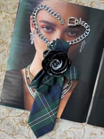 A dramatic UpTie crafted from upcycled tartan silk in deep forest green and midnight blue, gathered into sculptural folds and crowned with a glossy black rose. Finished with a bold silver chain, this one-of-a-kind piece blends classic tailoring with gothic romance and modern edge.