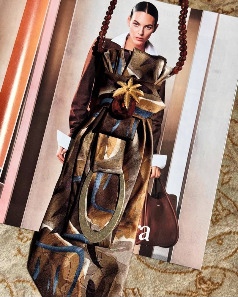 This UpTie is earthy elegance with a bold, artistic soul. Made from a richly patterned tie in deep chocolate brown, caramel, and hints of slate blue, it features abstract brushstroke swirls that give off a painterly, almost calligraphic vibe. Layered folds create striking dimension, while a golden oval pendant draws the eye downward with modernist drama. At the center is a golden palm-leaf brooch paired with a faceted amber stone — an unexpected mix of organic glam and sculptural chic. Finished with warm brown beaded chain links, this piece is a walk through an autumn art gallery.
