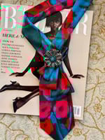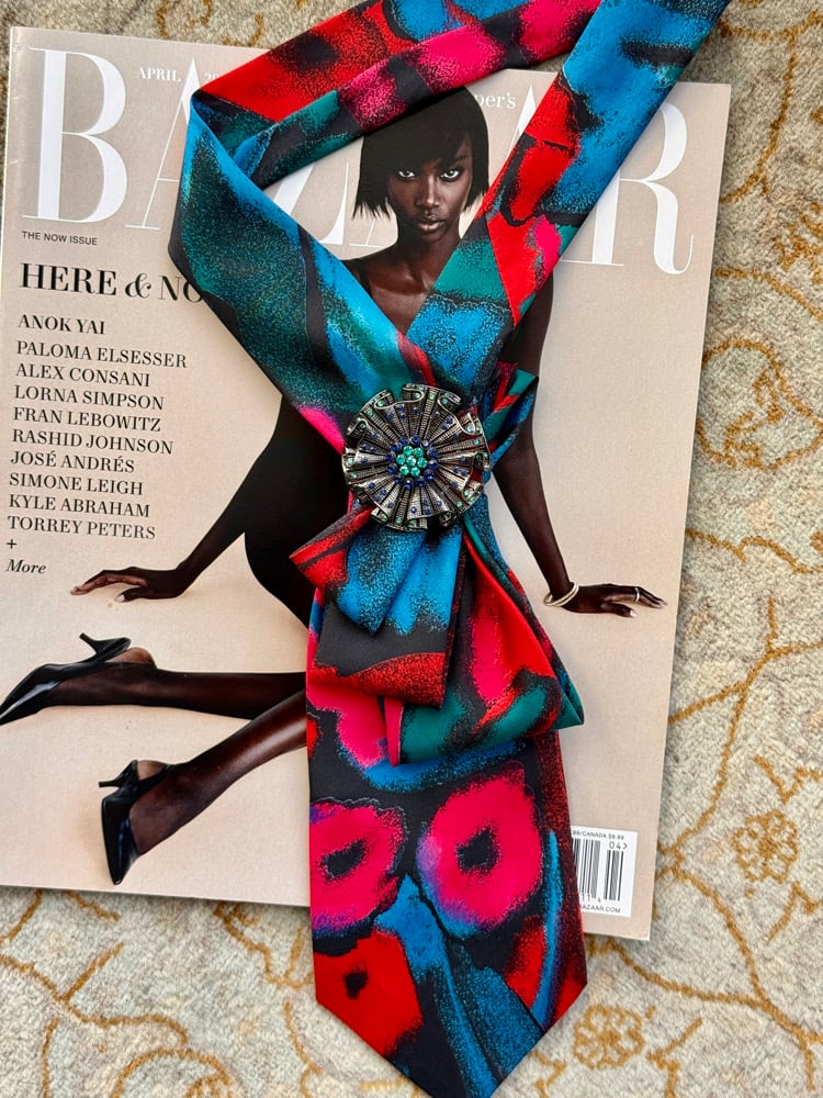 Upcycled silk bursts with saturated teal, cobalt, and hot pink brushstrokes, creating a painterly, almost graffiti-like rhythm. Gathered into sculptural folds and anchored with a radiant vintage brooch, this one-of-a-kind UpTie feels like wearable modern art—confident, expressive, and impossible to ignore.